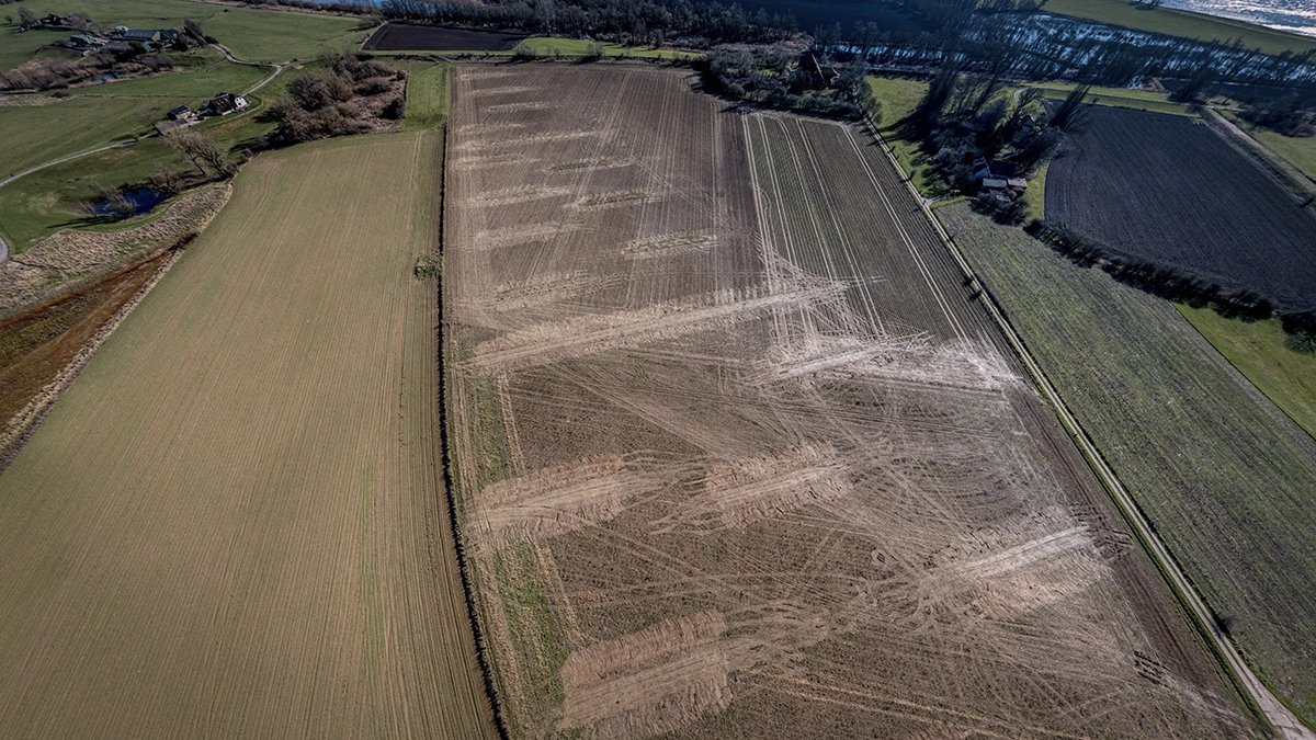 Verder zie je op het perceel C522 de 'littekens' die ontstaan zijn door het dichtgooien van de proefgeulen die waren gegraven ten behoeve van het archeologisch onderzoek, dat overigens niets heeft opgeleverd.